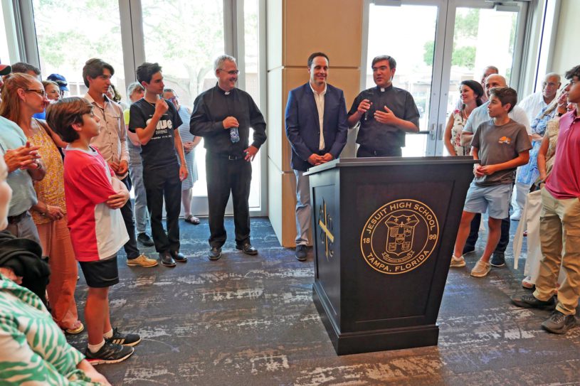 西班牙马拉加的著名圣艺画家劳乌.贝佐萨(Raúl Berzosa)近期为美国佛罗里达洲坦帕市(Tampa)耶稣会高中的安提诺里艺术中心(Antinori Center for the Arts)绘制了名为《耶稣会会士与艺术》(Los Jesuitas y las Artes)的三联式布面油画,并于 2023 年 4 月 23 日亲临该艺术中心大厅参与了画作揭幕礼。